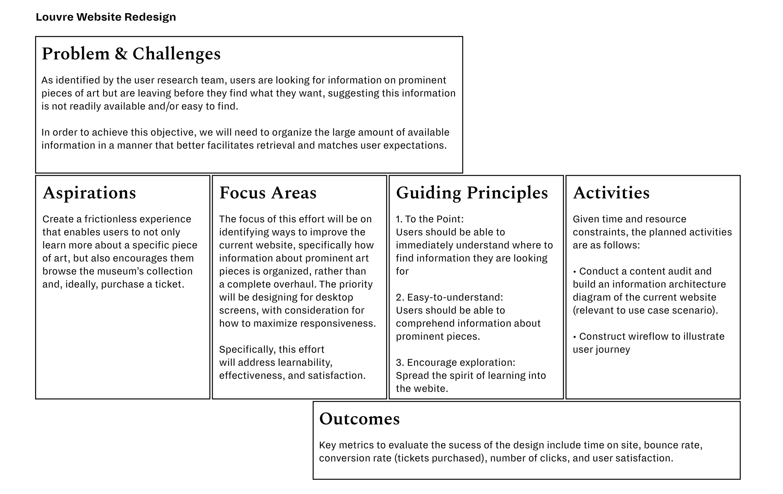 I conducted a partial content inventory which included the landing page as well as pages relating to prominent art pieces to get more detail about the content structure and identify which content can be reused, needs a refresh, and should be removed entirely. For this inventory, I focused on the main navigation bar which is featured directly above the slideshow.